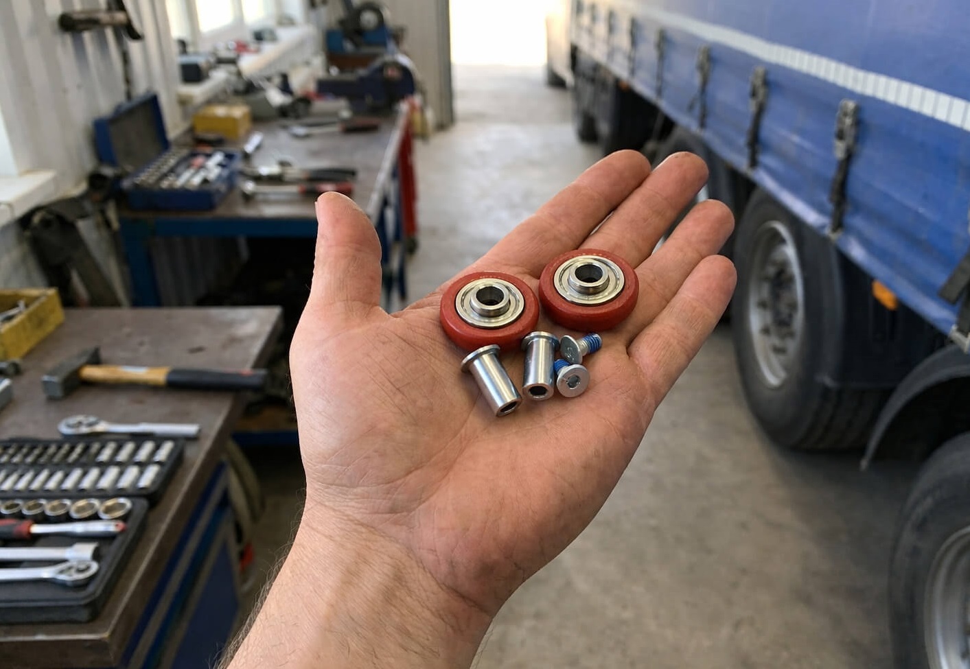 Роликовая система работает в направляющем алюминиевом или стальном профиле. Внутрь попадает песок, реагенты и влага.На полуприцепах Schmitz это особенно заметно после зимы: ролик начинает хрустеть, затем появляется люфт, и дальше нагрузка уходит на соседние каретки. У Krone часто страдает не только сам ролик, но и посадочное место - его «разбивает» при езде с перегрузом.